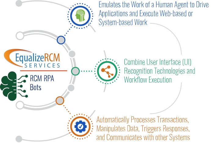 How do Robotic Process Automation (RPA) Bots Work? | Robotic Process Automation (RPA) is an emerging form of business process automation technology based on the concept of using software robots (a.k.a. bots). Powered by cognitive technologies like speech recognition, natural language processing (NLP), and machine learning (ML), these bots offer actionable insights, improved business efficiency, data security and effectiveness by imitating human actions, automating repetitive tasks across multiple business applications without altering existing infrastructure and systems. In the healthcare space, our proprietary RCM bots integrate with client systems, including electronic health records, billing systems, patient payment portals, payor portals, clearing houses, credit card processing applications and the like. This automation is usually ideal for supervised learning, rule-based, repeatable processes that leverage the organization’s key systems, including claims follow-up, payment posting, AR calling, converting paper EOBs to ERA, and more. |